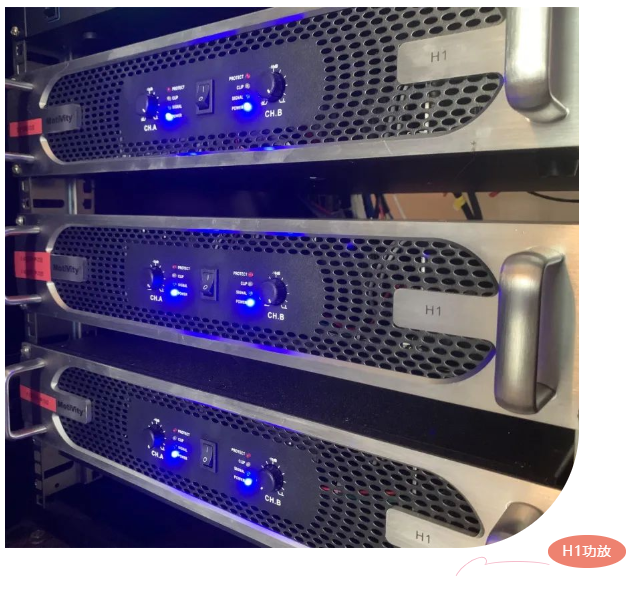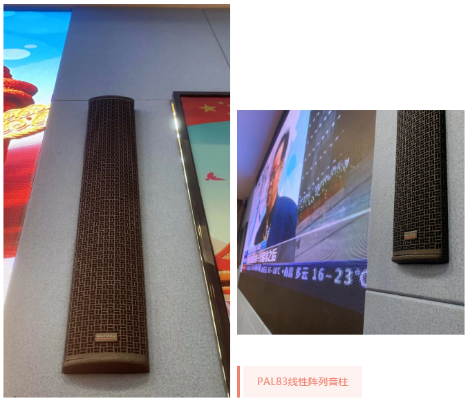 使用了兩只PAL83線性陣列音柱作為主擴音箱,嵌入式安裝于大屏幕兩邊,天花安裝了6只CM-6吸頂補聲音箱(分兩只一組,共3組),搭配3臺H1功放進行揚聲器功率放大。整體上既保證了現場擴聲均勻度,又能與環境融為一體,視覺上顯得