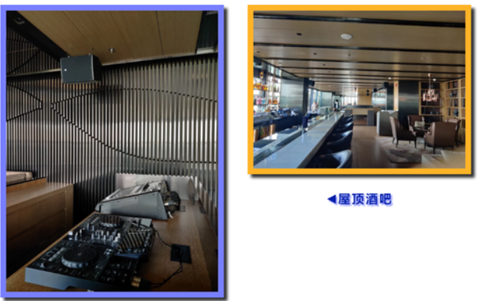 27樓屋頂酒吧Flair,分室內(nèi)室外兩部分,配置DJ打碟機(jī),主擴(kuò)聲由EV SM系列全頻同軸+15寸超低音組成,室外視野極佳,就坐于池水邊。身邊綠植叢中隱藏的EV 8寸蘑菇音箱同步播放室內(nèi)音樂(lè),品美酒賞夜景甚為愜意,開業(yè)即成為高新區(qū)的一個(gè)新的網(wǎng)紅打卡地。