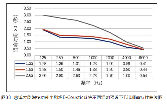 此項目在原有聲學條件的基礎上,最終調試完成并交付使用時共設有6種預設模式,其中Nice room模式下,E-Coustic系統主要用于早期反射聲的增強,只加入了少量的混響聲能,使得廳堂在此模式下,擁有更高聲能量以及聲場均勻度,因此,同時提升了語言清晰度,適合會議、講座等場景使用。此外幾種模式的混響時間預設分別為1.3 s、1.5 s、2.6 s等,這些模式均可根據多功能小劇場不同的使用場景,通過觸摸式操作面板來進行切換。本項目調試階段特地邀請了上海交響樂團的弦樂四重奏來模擬正式演出場景,通過開閉電子聲學環境可變系統的對比評價,演奏者反饋聲學環境變化十分明顯,加載本系統后演奏中的廳堂感和交互感有了明顯的提升。本廳堂加載三種不同混響時間預設模式的T30實地測量結果如圖38。