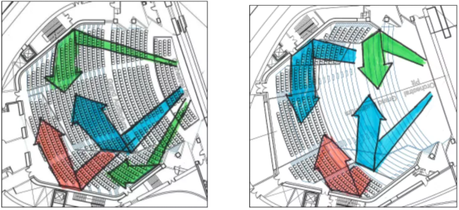 下圖是歌劇廳的一階反射聲,即聲音從舞臺擴(kuò)聲器發(fā)出后經(jīng)過第一次反射的路徑分析。從各個箭頭的指向與長度可以看出,聲音到達(dá)各區(qū)域座位距離、時間相當(dāng),也就是各區(qū)域觀眾都能有相似的聽覺體驗(yàn)。