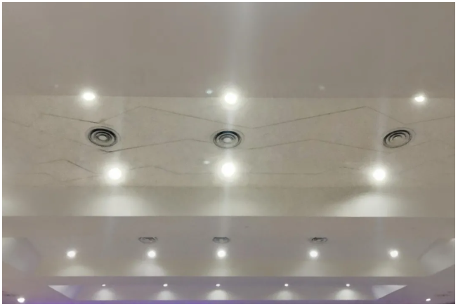 考慮到高層觀眾離天花更近,回音影響更大,在騎樓、高層處的天花與墻面需要更強(qiáng)的吸音效果。設(shè)計師巧妙地將空調(diào)回風(fēng)口與燈架一起設(shè)置在天花板與兩側(cè)上方,既完成了座椅下送風(fēng)、頂棚回風(fēng)的節(jié)能空氣處理系統(tǒng),又通過凹凸不平的墻面削弱了回聲。