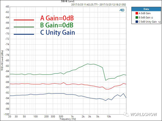 對于數字調音臺,我們不僅要關心話放增益在0dB時的THD+N比率,還需要了解到,話放增益在不同位置時的情況,因為這是使用中的實際情形。話放的增益在不同大小時,其引入的噪音和失真也是不同的,了解這一點對于用戶正確設置增益也很有參考意義。