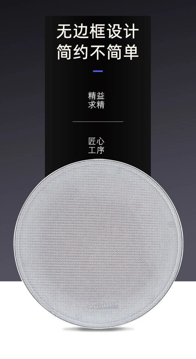 從外形上,我們圍繞著極簡主義風格設計,嚴選金屬材質,硬度較強,能夠大大減少諧振的產生,將低、中、高三頻還原的更精準。網罩采用了無邊框設計,加上顏色純黑的磨砂質感,視覺上可塑性強,更好契合墻面和天花。