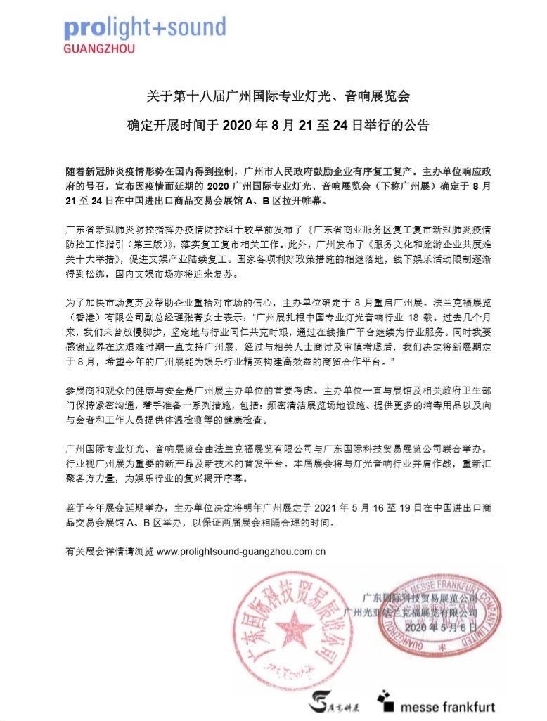 為了加快市場復蘇及幫助企業重拾對市場的信心,主辦單位確定于8月重啟廣州展。法蘭克福展覽(香港)有限公司副總經理張菁女士表示:“廣州展扎根中國專業燈光音響行業18載,過去幾個月來,我們未曾放慢腳步,堅定地與行業同仁共克時艱,通過在線推廣平臺繼續為行業服務。同時我要感謝業界在這艱難時期一直支持廣州展,經過與相關人士商討及審慎考慮后,我們決定將新展期定于8月,希望今年的廣州展能為娛樂行業精英構建高效益的商貿合作平臺。”