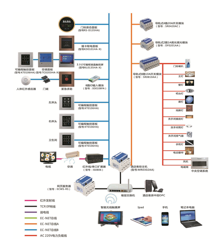 基本功能:照明開關、電動窗簾開合、插座控制、空調本地控制、空調聯(lián)網控制、背景音樂控制、模式控制、房態(tài)監(jiān)視。