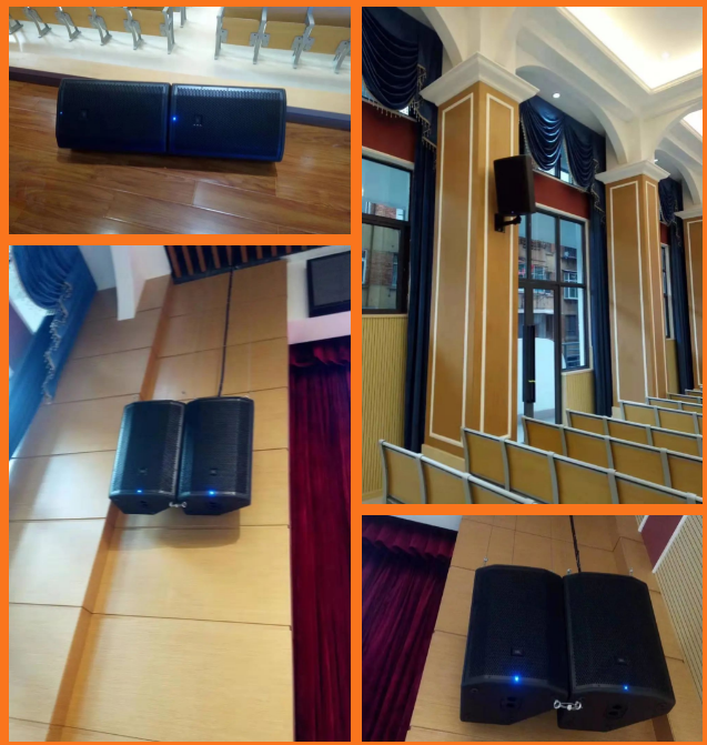 綜合報告廳的需求,音響均采用了美國JBL PRX800W智能有源揚聲器系統,主擴聲左右聲道各采用兩只PRX815W,單只聲壓可達137dB,報告廳輔助補聲采用壁掛方式,采用了底部角度可選雙孔設計的PRX812W,演講臺上擺放四只PRX812W作為流動返送,舞臺下方內嵌擺放兩只PRX818XLFW作為低音補充。