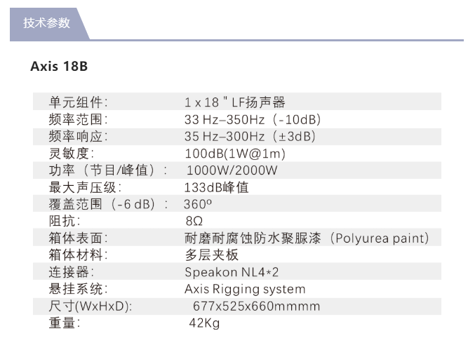 Axis18B采用1只18" 特別定制的(3"v.c.)低音單元,箱體直射倒相式箱體結(jié)構(gòu)設(shè)計(jì),吊掛系統(tǒng)采用鋁合金材質(zhì),與Axis20V組合,可吊掛、可堆疊,用以提升系統(tǒng)低頻表現(xiàn),箱體采用18mm樺木膠合板制成,涂有耐磨耐腐蝕的防水聚脲涂層。Axis18B能將整個(gè)系統(tǒng)的頻率范圍擴(kuò)展到35Hz。