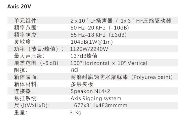2x10"低音揚(yáng)聲器(3"v.c.)提供擴(kuò)展低頻再現(xiàn),與安裝在專門(mén)設(shè)計(jì)的波導(dǎo)管上的一個(gè)高頻壓縮驅(qū)動(dòng)器(3"v.c.)相互作用。這種對(duì)稱聲學(xué)設(shè)計(jì)產(chǎn)生了最精確的瞬態(tài)再現(xiàn),使Axis20V能夠提供最細(xì)致和均勻的音頻性能。
