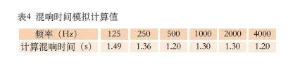 從表4可以看出,混響時間及頻率特性滿足設計指標要求。從表3和表4可以看出,混響時間模擬值比混響時間計算值長0 . 2 s 。根據實際工程經驗,模擬結果更接近現場實測值。